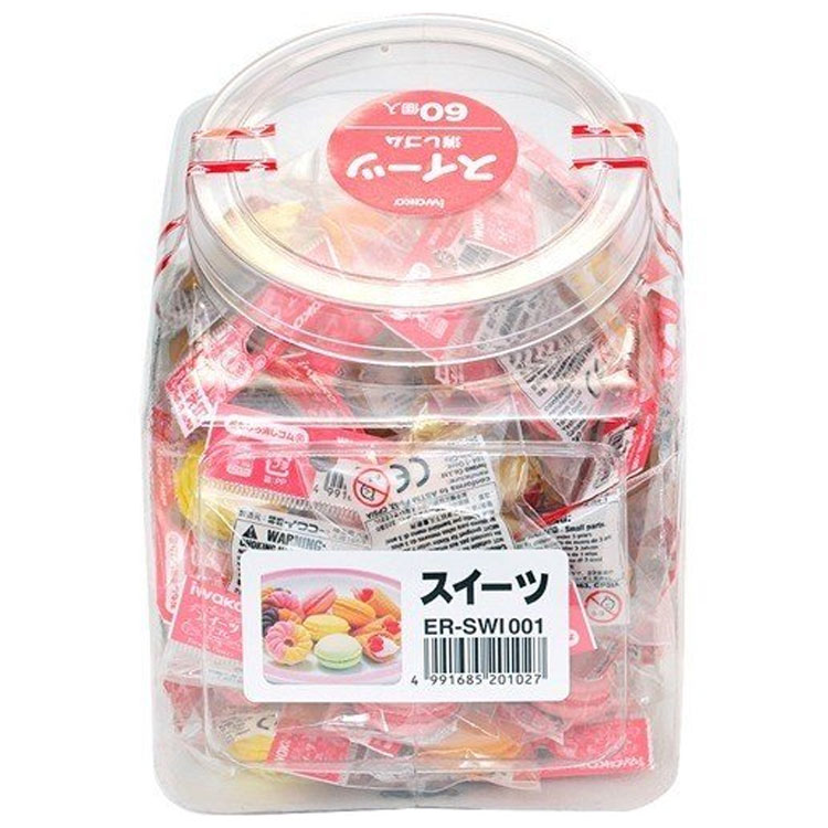 仕様内容 【60個入ボトルサイズ】約140×190×150mm 【単品パッケージサイズ】約60×20×70mm 【内容】マカロン(ピンク)6個、マカロン(オレンジ)6個、マカロン(イエロー)6個、マカロン(グリーン)6個、フレンチドーナツ(ココア)6個、フレンチドーナツ(カスタード)6個、フレンチドーナツ(チョコ)6個、ワッフルコーン(白)6個、ワッフルコーン(ピンク)6個、ワッフルコーン(イエロー)6個 【材質】SBSエラストマー樹脂(塩化ビニール樹脂は使用していません) 【原産国】日本 特記事項画像はあくまでも商品イメージになります。