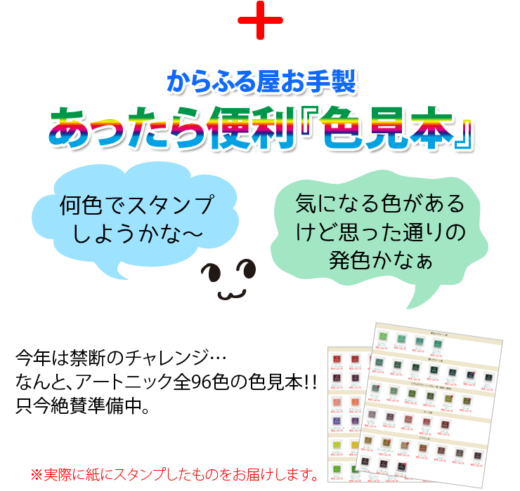 実際にインクを捺して作った『色見本』と、人気の消しゴム『はんけしくん』のセットです。